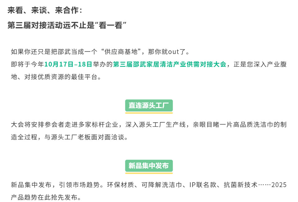 邵武以其惊人的产业集中度——国内洗洁巾市场80%的份额,成为行业瞩目的焦点。作为一座偏居一隅的山城,邵武为何能崛起一项傲视全国的产业?其背后有着怎样的产业逻辑?即将到来的对接大会,又将为您带来什么?