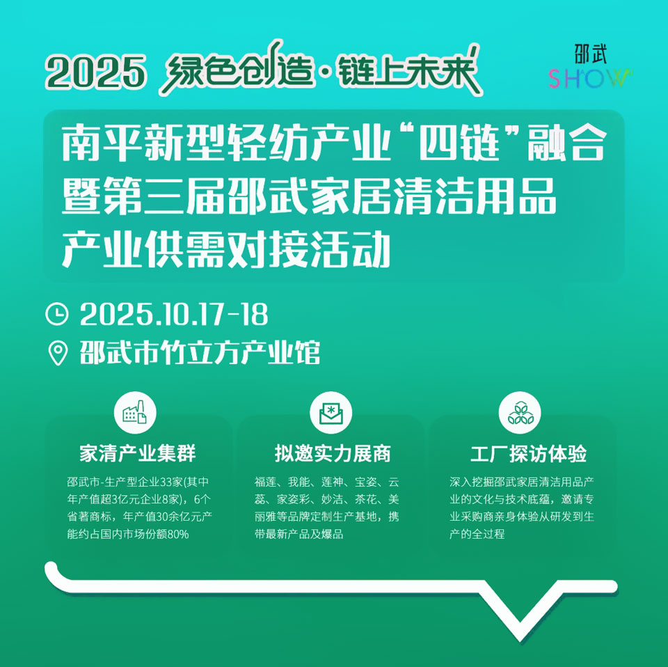 2025年10月17-18日,南平新型轻纺产业“四链”融合暨第三届邵武家居清洁用品产业供需对接活动将在福建邵武这片热土再度启幕。