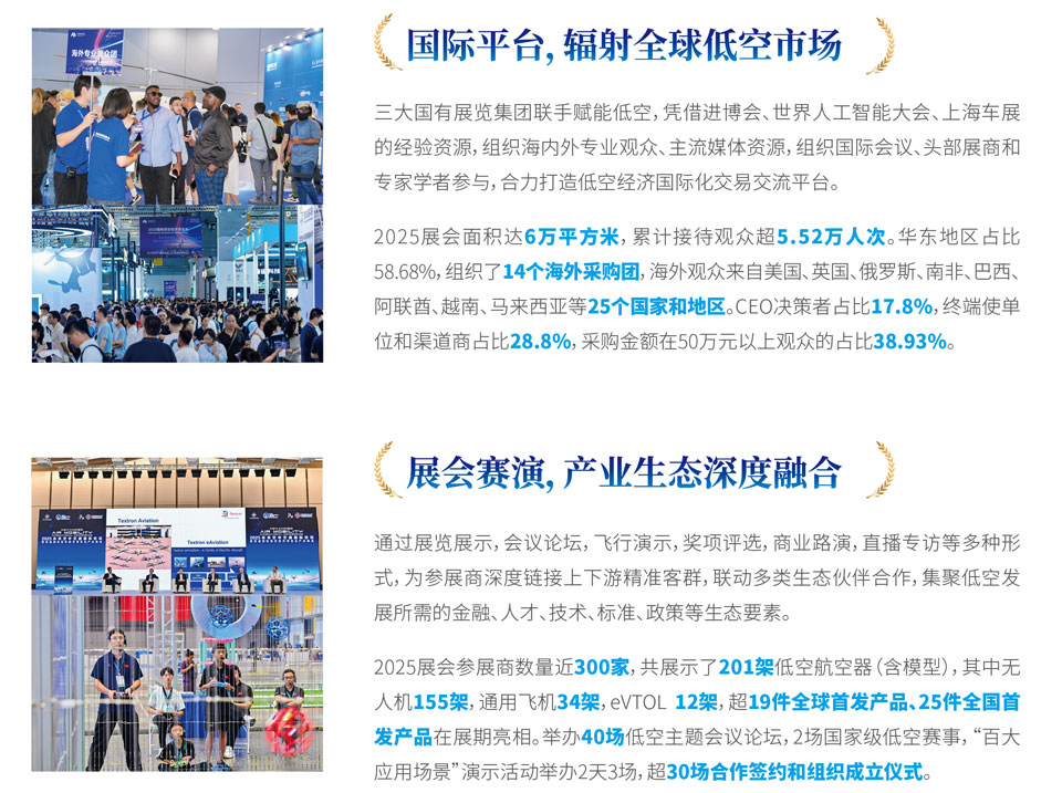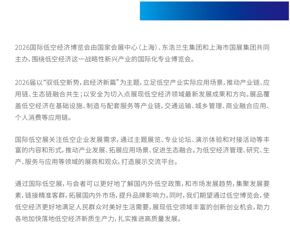 2026国际低空经济博览会将于2026年7月22日至25日在国家会展中心(上海)开幕,主题为“驭低空新势,启经济新篇”。新一届博览会将立足推动低空经济高质量发展,加速低空应用场景深度挖掘和实践落地,驱动产业链、应用链、生态链“三链”融合共生,描绘协同高效的健康发展体系;以安全为切入点,聚焦行业创新与实践成果,集中展现低空经济领域“三新”:新技术、新成果和新方向,为行业发展提供清晰路径指引。