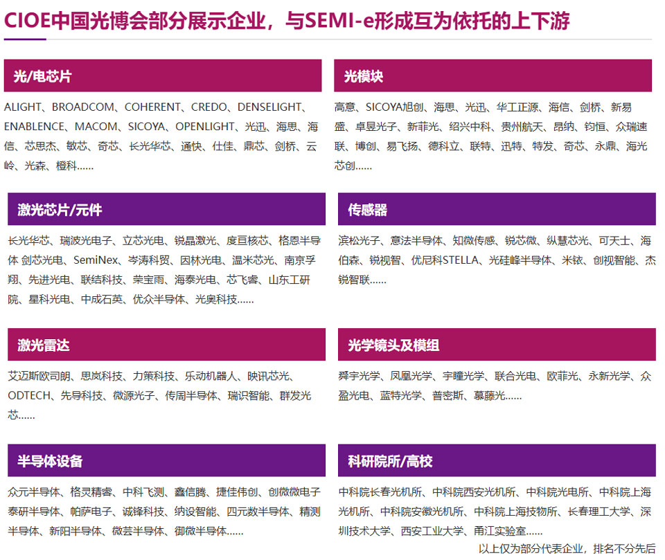 ● CIOE中国光博会集中展示半导体产业链中的传感器及光电子器件,如光电芯片、光器件、光模块等关键核心技术;