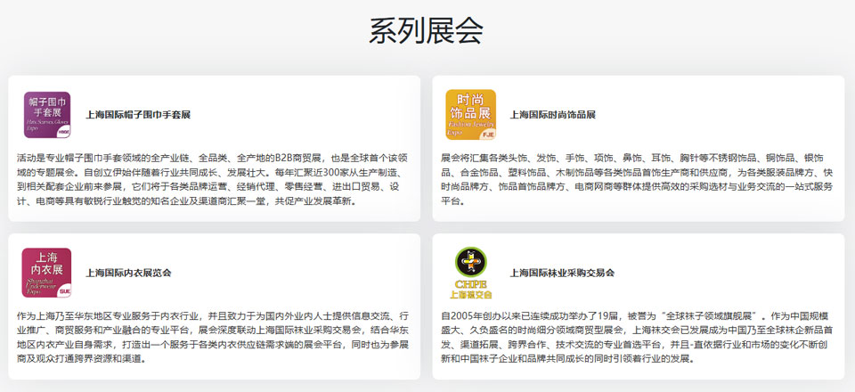 由上海服饰学会、上海歌华展览服务有限公司共同主办,逸尚创展(上海)科技有限公司协办的Fashion Accessories Shanghai 2026上海国际时尚配饰展(简称:歌华·时尚配饰展)将于2026年3月23日至25日在上海世博展览馆盛大召开。该展会是由歌华展览旗下系列时尚配饰展集合而成,它们包括:上海国际帽子围巾手套展、上海国际时尚饰品展、上海国际袜业采购交易会、上海国际内衣展览会。活动将以供应链为基础,聚焦穿着搭配的潮流趋势发展,集多个系列时尚领域专业的细分展会于一体,不仅将为时尚消费产业寻找增量、提供热点及流量入口,同时也为配饰行业提供品牌对接、进出口贸易渠道和宣传推广平台的各类商机,推动时尚配饰全产业链高质量融合发展。