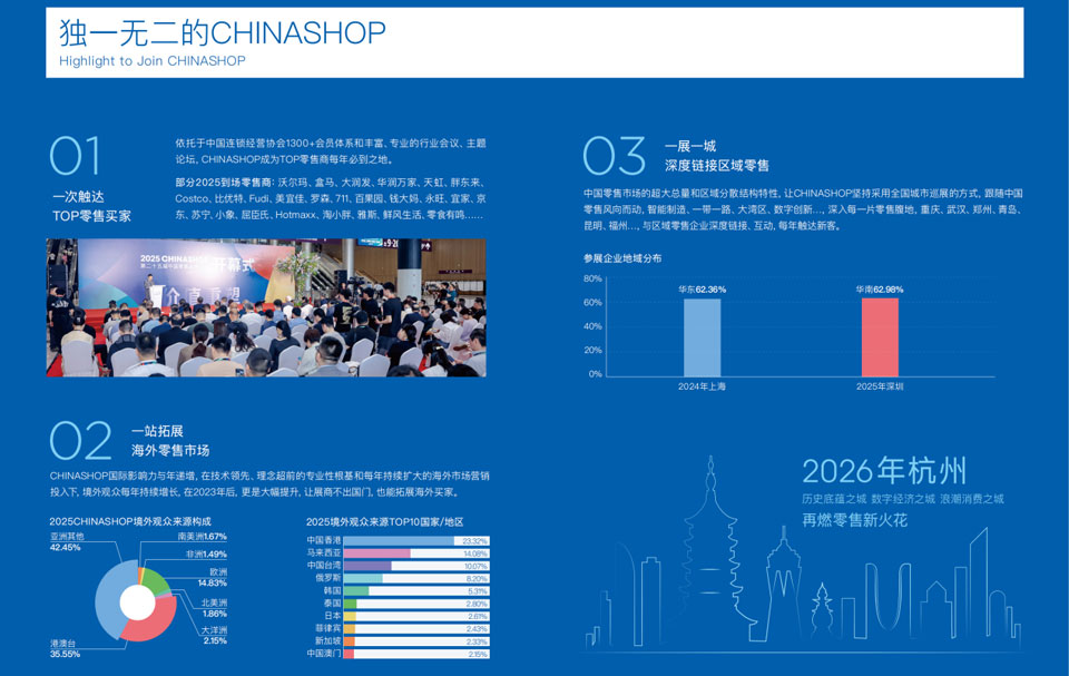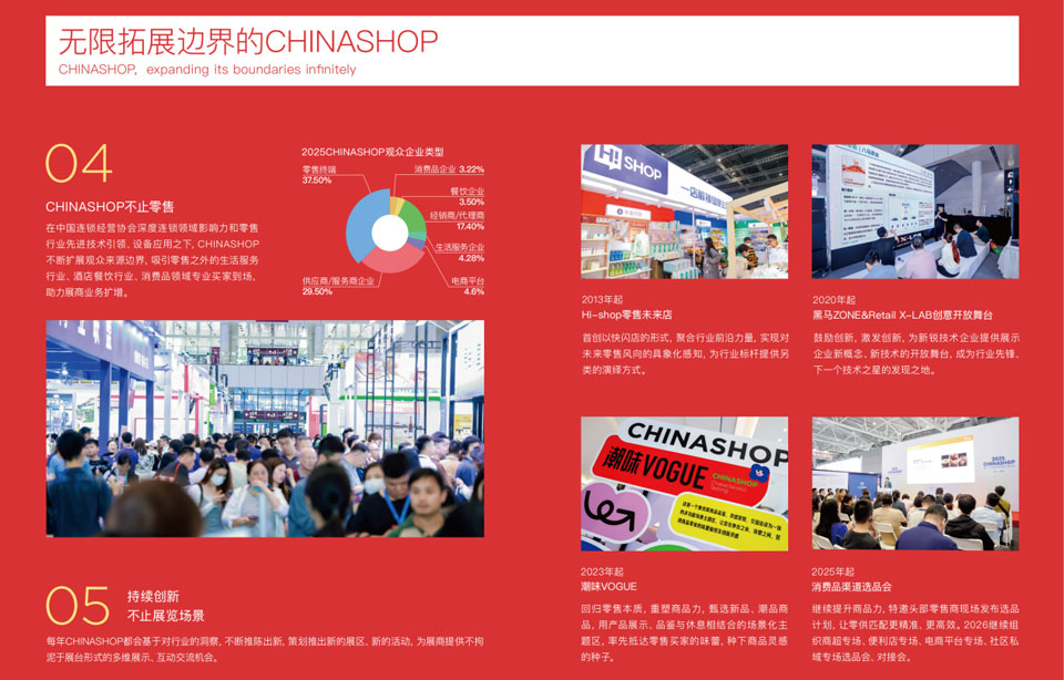 中国零售业博览会(CHINASHOP)创办于1999年,在秉持着为行业搭建高效、精准的零供对接平台初衷之下,规模不断扩增,达到10万㎡超大展示空间,展品范围不断扩大,涵盖零售设施设备、创新技术、潮流商品与零售品牌等全产业链,现场活动不断丰富,从Hi-shop到Retail X-lab,从黑马专区到潮味VOGUE,从消费品渠道选品会到CCFA新消费论坛系列会议,内容涵盖之广 内涵专研之深,参与人员之众,成为零售行业每年必去的顶级盛事。CHINASHOP一词也成为了解中国零售、看尽中国零售的代名词。