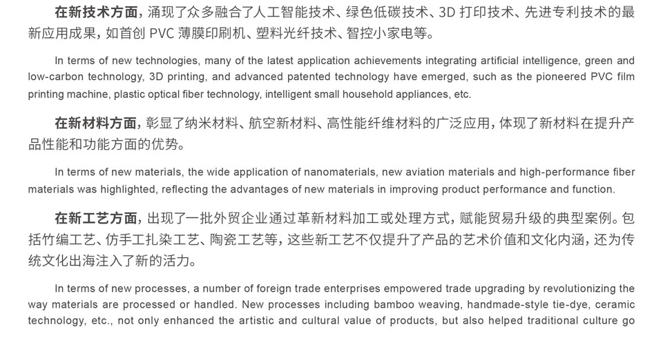 第33届华交会积极顺应我国贸易转型升级、推动外贸高质量发展的新形势与新要求,参展企业结构明显优化,跨界企业比例提升,产业链协同效应逐渐凸显。其中,品牌企业占比达20%,专利企业占比15.2%,拥有新材料、新工艺的企业占比6.6%,还有52家专精特新企业闪亮登场,展览的科技含量与创新浓度持续攀升。在新技术方面,涌现了众多融合了人工智能技术、绿色低碳技术、3D打印技术、先进专利技术的最新应用成果,如首创PVC薄膜印刷机、塑料光纤技术、智控小家电等;在新材料方面,彰显了纳米材料、航空新材料、高性能纤维材料的广泛应用,体现了新材料在提升产品性能和功能方面的优势;在新工艺方面,出现了一批外贸企业通过革新材料加工或处理方式,赋能贸易升级的典型案例。包括竹编工艺、仿手工扎染工艺、陶瓷工艺等,这些新工艺不仅提升了产品的艺术价值和文化内涵,还为传统文化出海注入了新的活力。
