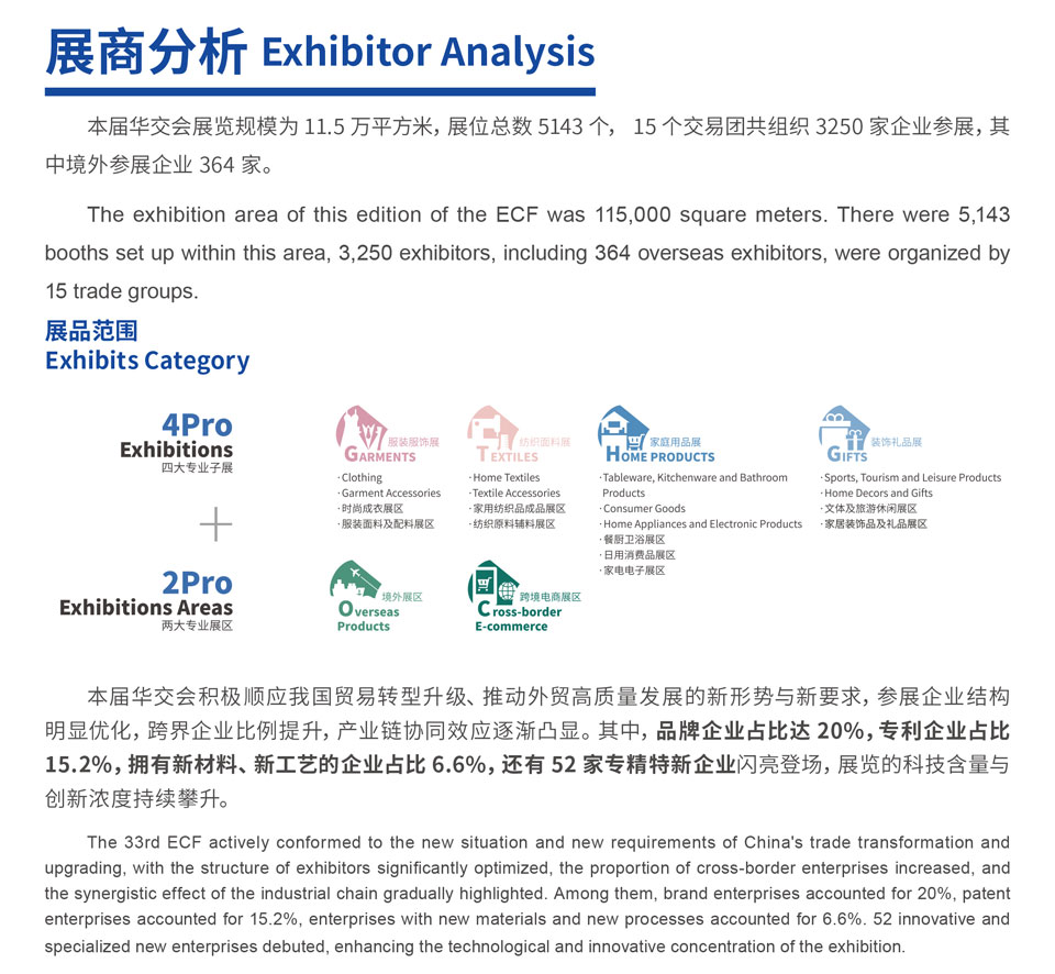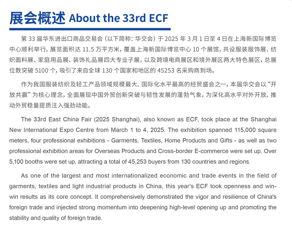 自1991年以来,华交会已成功举办了33届。第33届华交会在上海新国际博览中心举行,展览面积达11.5万平方米,展位总数5143个。设服装服饰展、纺织面料展、家庭用品展、装饰礼品展等4大专业主题展,以及境外展区和跨境电商展区2大专业展区。