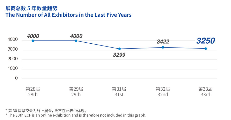 第33届华交会共有15个交易团,包括上海、江苏、浙江、安徽、福建、江西、山东、南京、宁波、杭州、厦门、青岛等主办省市和组团城市交易团,以及联合交易团、跨境电商交易团和境外交易团,共组织境内外参展企业3250家,其中境外展商364家,覆盖13个国家和地区。第33届华交会吸引了来自130个国家和地区的采购商,到会的境内外采购商超过4.5万人,展期实现意向订单金额21亿美元。