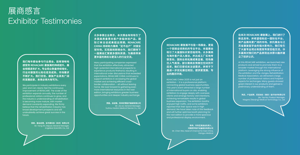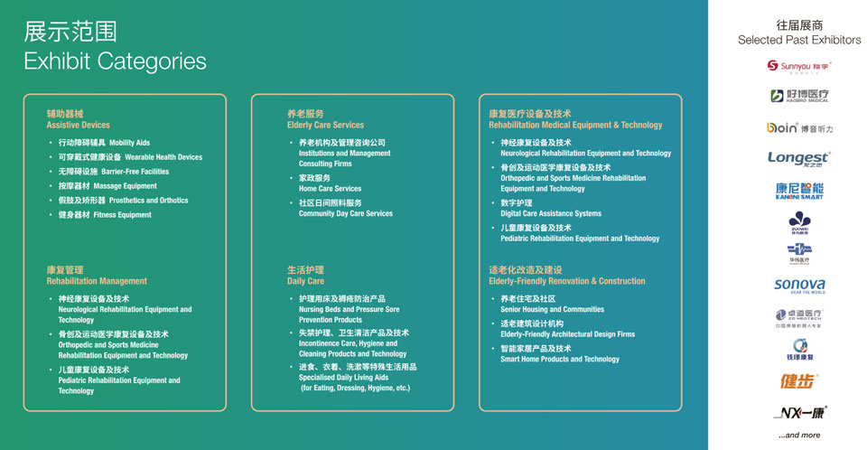 本届展会以“科技赋能,融创新生”为核心使命,旨在为中国老龄、残障人士及广大康复需求群体建立一个高水平的行业交流平台,并切实推动其与社会深度融合。展品范围全面覆盖外骨骼、运动康复、智能康复产品、康养机器人、家用医疗设备、养老康复用品、听力辅助设备、心肺康复产品以及适老化设施等全产业链环节,旨在为医院、康养机构、康复器械经销商、代理商和电商平台等构建一个精准、高效的国际性采供对接与行业交流中心。