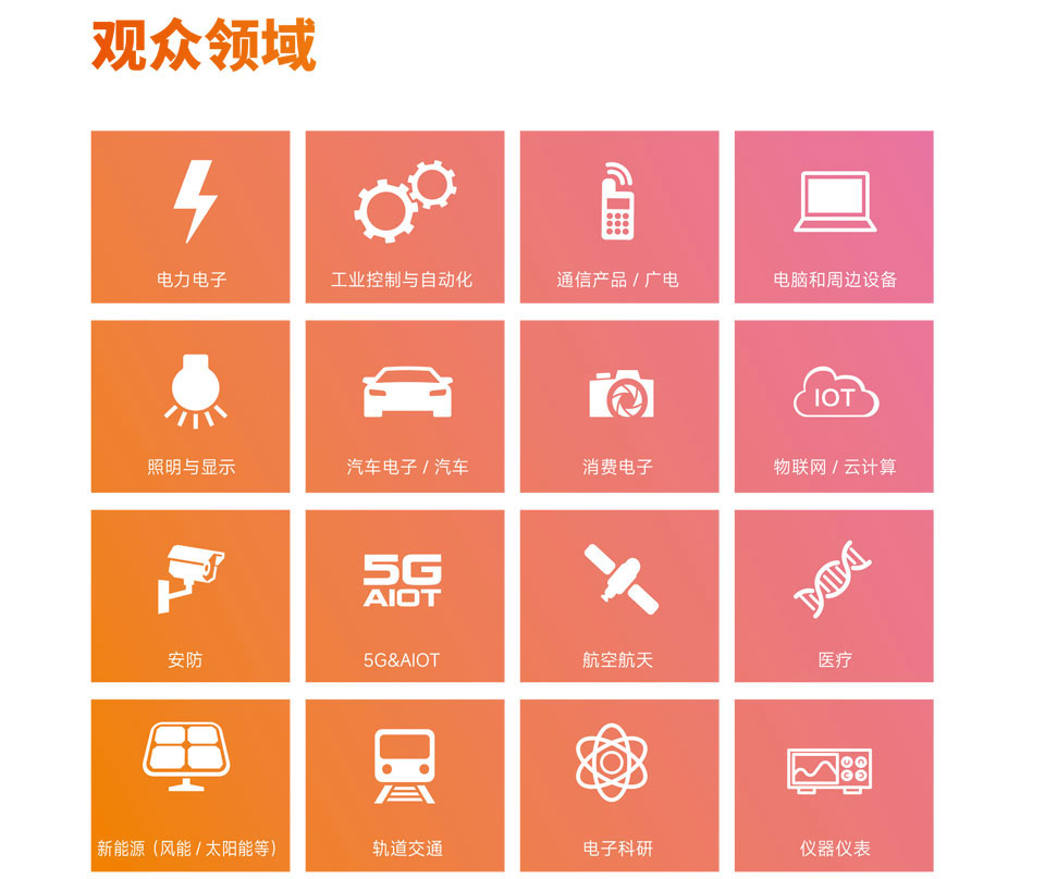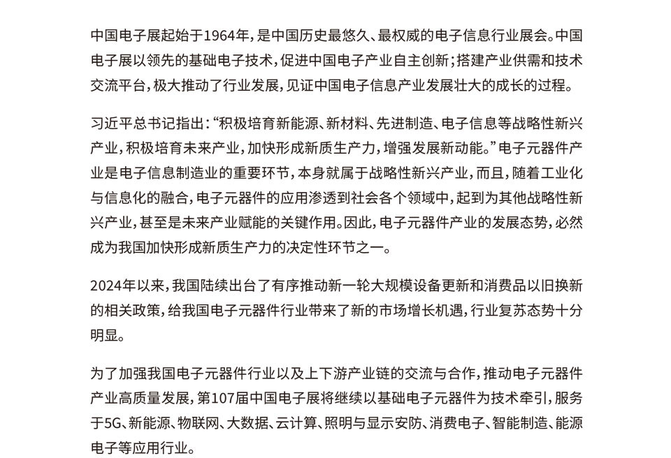 中国电子展起始于1964年,是中国历史最悠久、最权威的电子信息行业展会。中国电子展以领先的基础电子技术,促进中国电子产业自主创新;搭建产业供需和技术交流平台,极大推动了行业发展,见证中国电子信息产业发展壮大的成长的过程。为了加强我国电子元器件行业以及上下游产业链的交流与合作,推动电子元器件产业高质量发展,第107届中国电子展将继续以基础电子元器件为技术牵引,服务于5G、新能源、物联网、大数据、云计算、照明与显示安防、消费电子、智能制造、能源电子等应用行业。