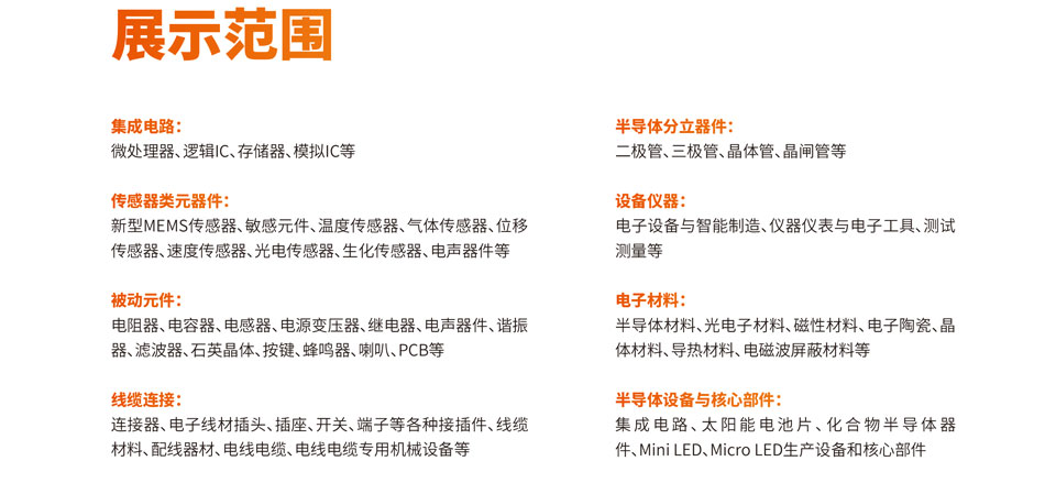 核心先导元器件:被动元件展区、半导体分立器件展区、连接器展区、传感器展区、半导体设备与核心部件展区、集成电路展区。