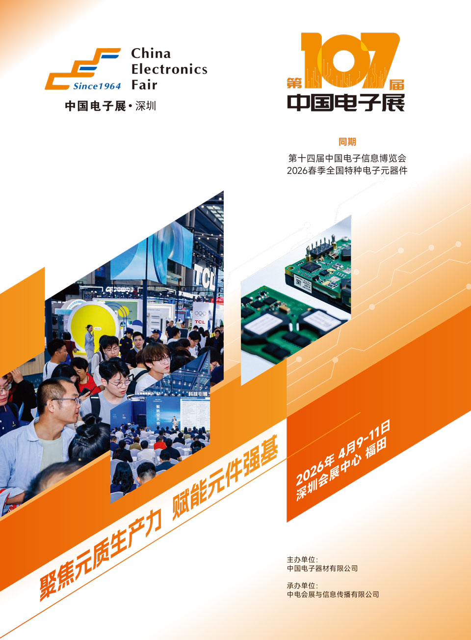 第107届中国电子展 · 深圳,以“聚焦元质生产力 赋能元件强基”为主题,于2026年4月9日-11日,在深圳深圳会展中心(福田)举办,届时同期举办第十四届中国电子信息博览会、2026春季全国特种电子元器件。
