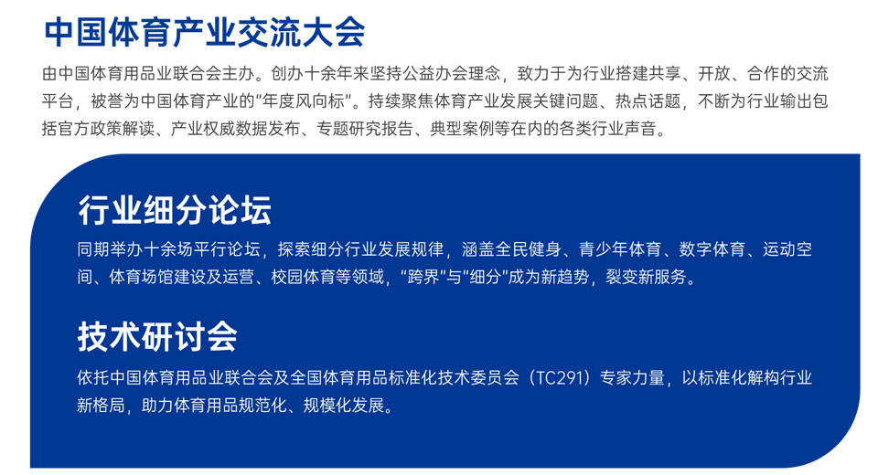 创办于1993年的中国国际体育用品博览会(以下简称“中国体博会”)(China Sport Show)由中国体育用品业联合会、中体联(北京)体育产业发展有限公司、中体联(海南)体育科技产业发展有限公司主办,中体联(海南)体育科技产业发展有限公司承办,是亚太地区规模最大、最为权威的综合性体育用品展会,是中国体育品牌向世界展示实力的重要窗口,也是全球体育品牌进入中国市场的捷径。在中国体博会的平台上汇集了体育用品、体育营销资源、体育文化与科技等行业趋势内容,是体育用品企业在中国及世界范围进行品牌推广和渠道拓展的重要平台。