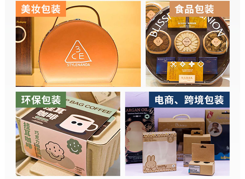 包装制品:礼品包装、电子产品包装、化妆品包装、钟表盒/珠宝盒、茶叶包装、烟酒包装、食品包装、彩盒包装等消费品包装。