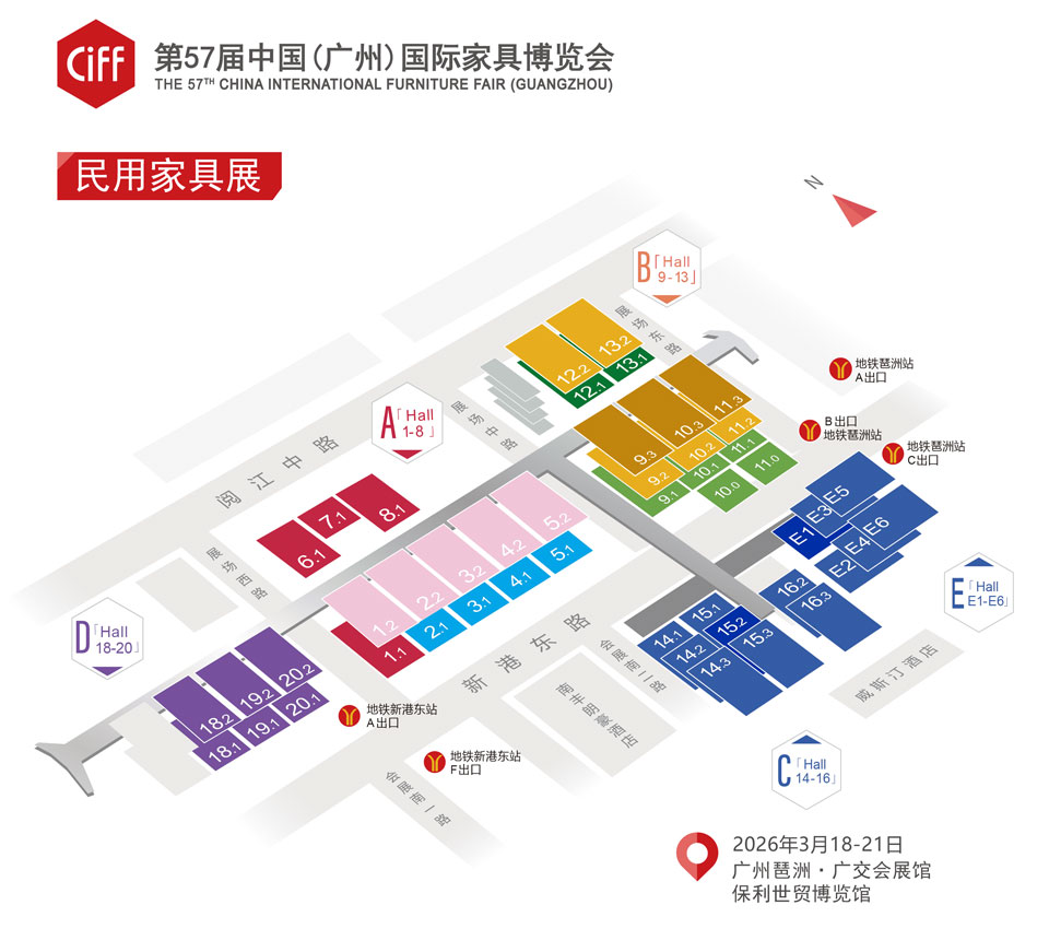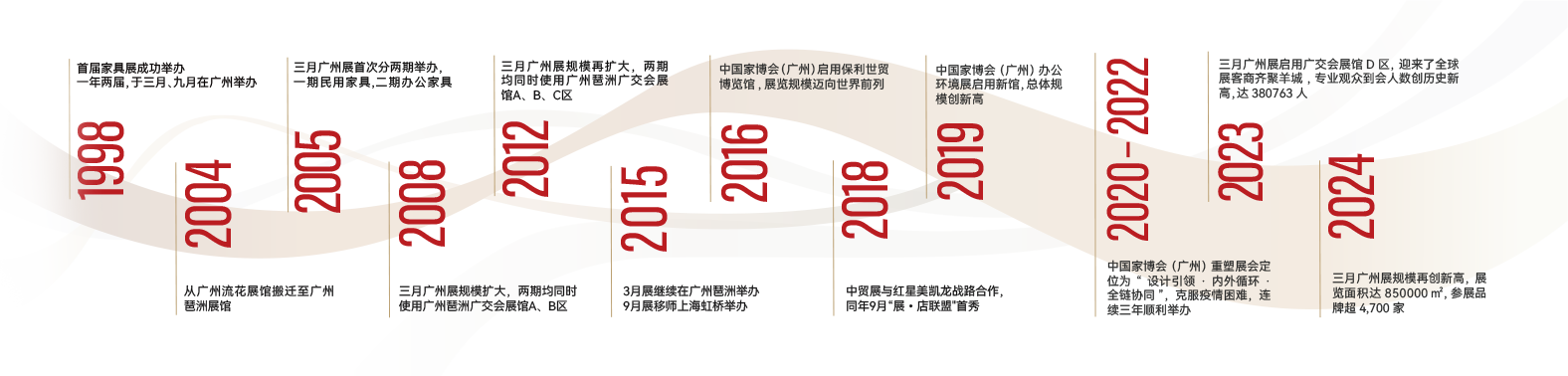 中国对外贸易中心集团有限公司旗下中国(广州/上海)国际家具博览会(简称中国家博会)创办于1998年。从2015年9月起,每年3月在广州琶洲、9月在上海虹桥举办,有效辐射珠三角和长三角两大最具活力经济圈,2024年5月,中国家博会(天津)在天津创办。中国家博会(广州)以“设计引领、内外循环、全链协同”为定位,盛大展出民用家具、饰品家纺、户外家居、办公商用及酒店家具、家具生产设备及配件辅料等全题材产品,是以全题材、全产业链为鲜明特色的全球性大家居博览会,每届汇聚超4900家海内外顶尖品牌企业,接待200多个国家和地区的38万名专业观众。中国家博会(广州)始终致力于促进家居行业传统消费升级、服务构建新发展格局,不断提升展览品质、推动高质量发展,不断为行业、产业、企业带来更多更好的价值。