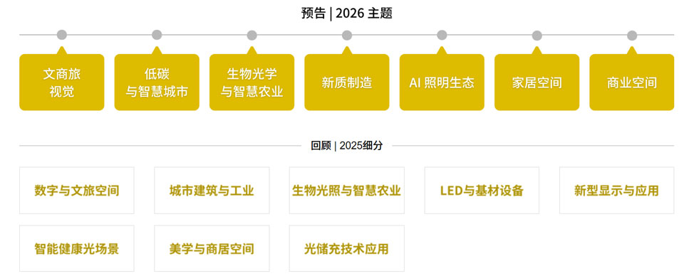 LED 技术:LED芯片组及光源(LED 光源、UV - LED光源、红外线LED光源、OLED光源);电源、驱动及电子元器(电源供应、LED 驱动及驱动IC、变流器、变频器、整流器、LED 控制装置、LED模块及光引擎);LED特殊应用(植物照明、车用照明、紫外线杀菌照明);