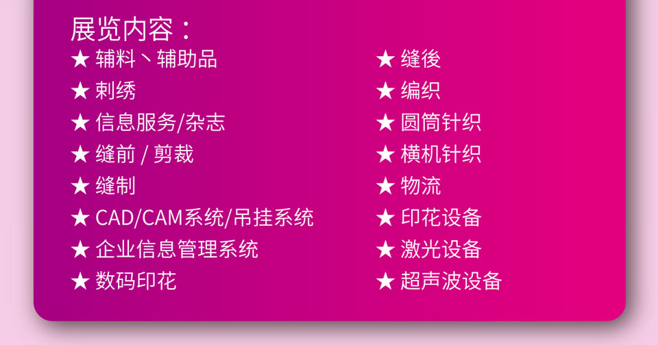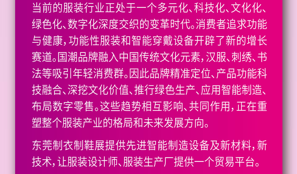 2026大湾区制衣制鞋/华南国际缝制设备展集中展示国内外先进的服装、鞋履与箱包生产设备,包括缝纫设备、编织机械、绣花及激光设备、超声波设备、数码印花设备、整熨包装、鞋机鞋材、自动化生产线、软件系统技术及功能零部件等,将以『智能+可持续』双引擎为核心,集中展示全球前沿技术与应用场景,为企业构建覆盖设计、生产、管理全链条的“智能+可持续”一体化解决方案。