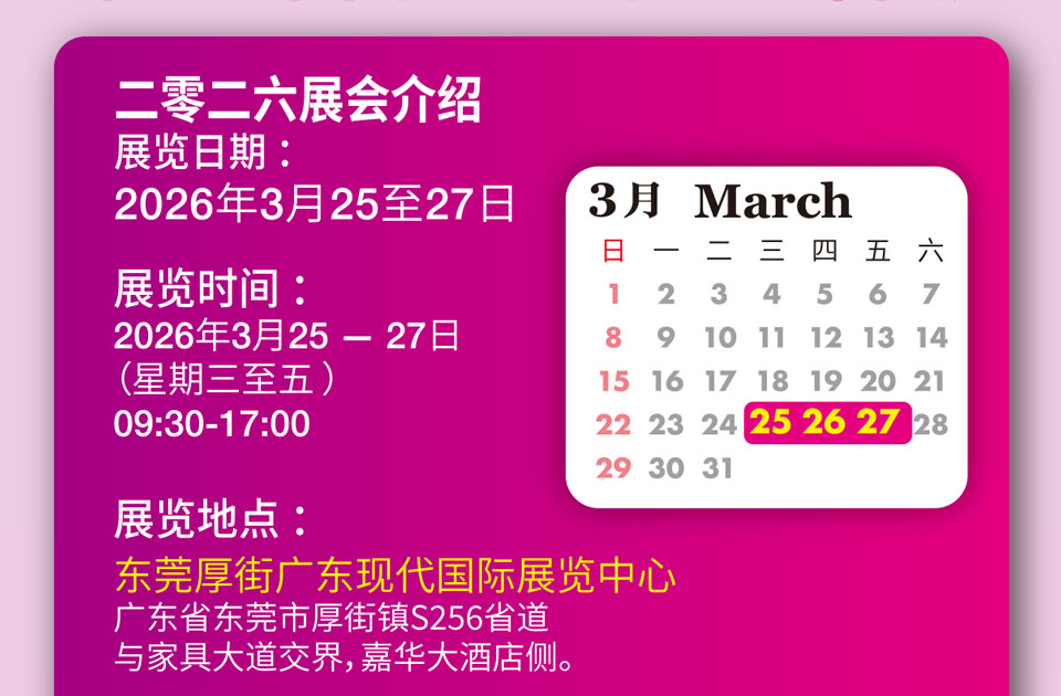 “2026大湾区国际智能纺织制衣工业设备展暨华南国际缝制设备展/大湾区国际智能鞋机鞋材工业设备展”(以下简称“大湾区纺织制衣暨华南国际缝制设备展”)将于2026年3月25-27日举办,与大家在东莞厚街-广东现代国际展览中心再度起航。本次展会由讯通展览公司、广东省缝制设备商会、广东省鞋机协会、海名国际会展集团联合主办。2026大湾区纺织制衣暨华南国际缝制设备展将延续二十余载行业积淀,坚持与产业发展联动,持续打造集展览、采购、直销于一体的展贸一体化平台,以『AI设计+智能智造』与可持续技术应用赋能新质生产力发展,助力缝制设备企业抢占智能智造赛道,为纺织制衣终端用户提供降本增效的解决方案,全面推动纺织制衣及缝制设备行业的技术革新与产业升级。