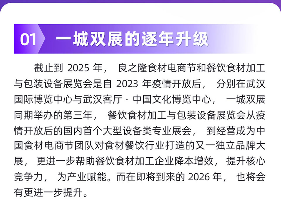 2026年3月28-31日,良之隆·2026餐饮食材加工与包装设备展览会和良之隆·2026中国食材电商节将在中国文化博览中心(武汉客厅)与武汉国际博览中心同期举行,持续以一城双展的模式绽放,全方位创新升级,打造2026年食餐产业生态新联盟。
