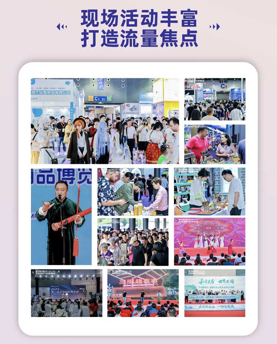第19届中国义乌文化和旅游产品交易博览会立足义乌市场优势,紧贴市场需求,以"小商品大市场,乐生活享世界"为主题,聚焦"市场化,专业化,品牌化,国际化,数智化"五个高质量发展方向,展出产品超20万种,涵盖IP文创,旅游商品装备,收藏品文创,电竞动漫等领域。展会借助"展会+商贸"的高效联动机制,紧密连接国际商贸城文旅产品经营户的上下游产业链,强化展会与市场的高效联动。