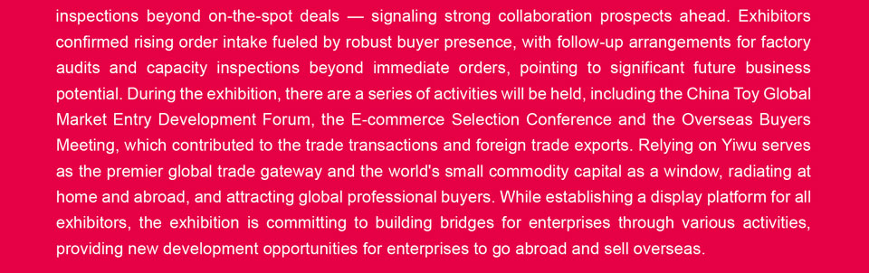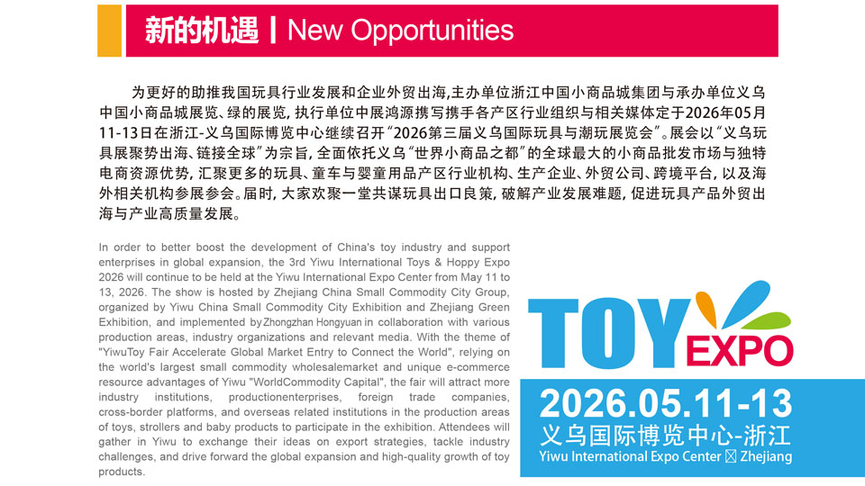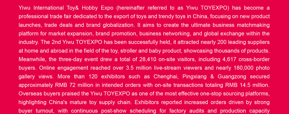 2025义乌国际玩具与潮玩展览会(以下简称“义乌潮玩展”)已于2025年6月13日至6月15日在义乌国际博览中心圆满举行。作为文旅博览会核心板块之一,本次义乌潮玩展参展企业220家,设国际标准展位306个,展览面积达1.5万平方米,展品品类涵盖潮玩文创类、IP授权类、毛绒玩具类、益智玩具类、塑胶玩具类、童车及手推车类等。2026义乌国际玩具与潮玩展览会将于2026年5月11日至13日在义乌国际博览中心举行,展会以“义乌玩具聚势出海,链接全球"为宗旨,计划设800个国际标准展位,展览面积2万平方米,预计到会采购商及观众达5万人次。