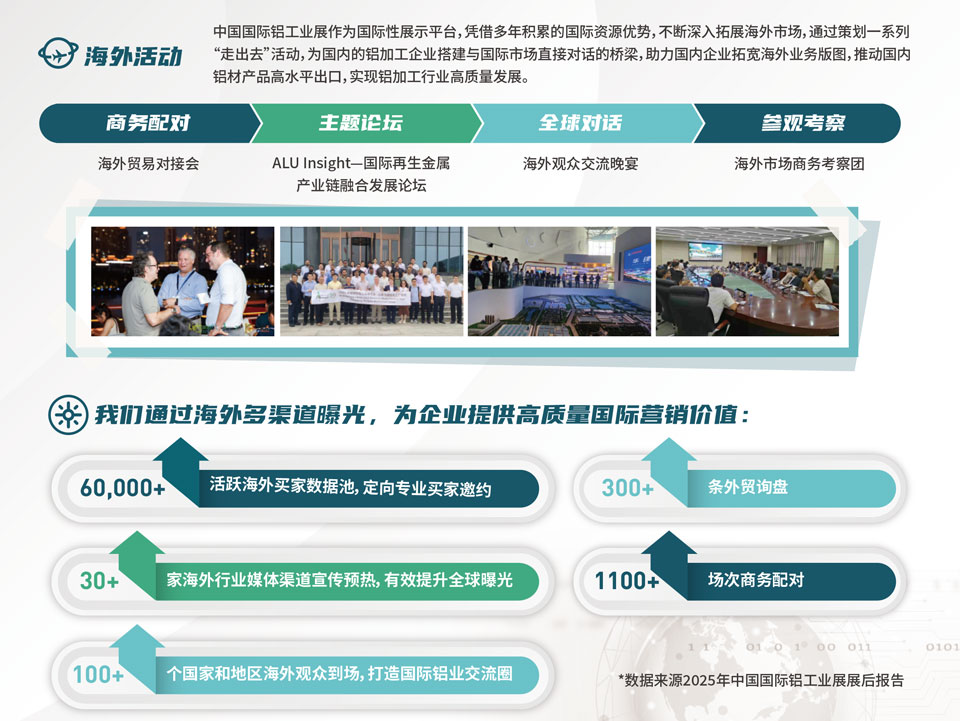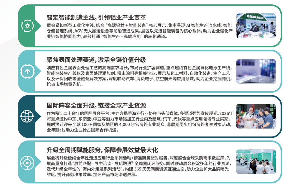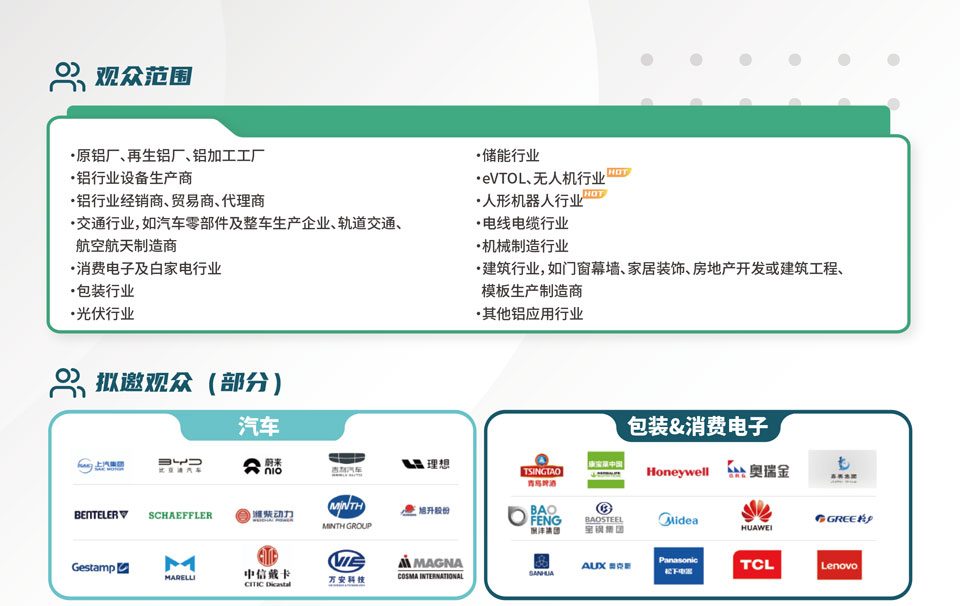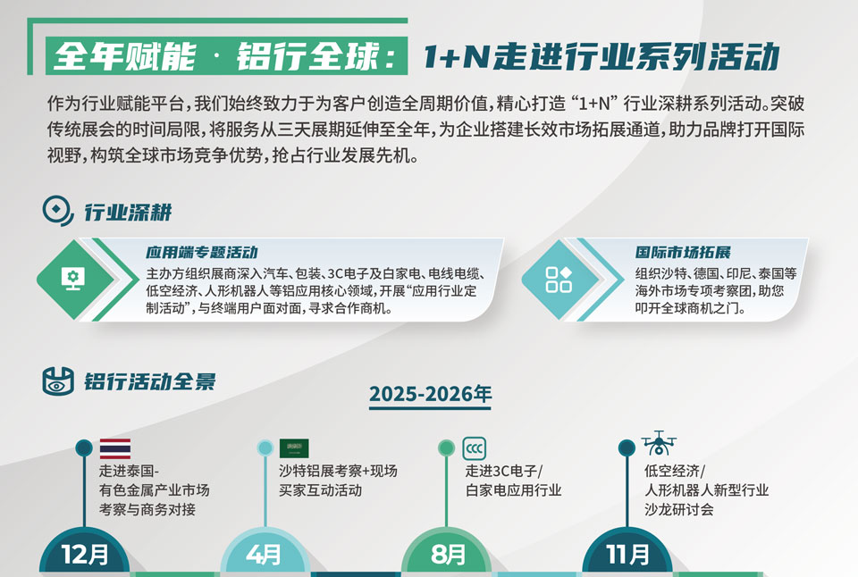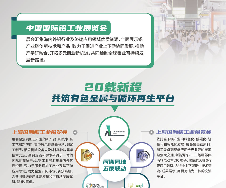 中国国际铝工业展览会汇集海内外铝行业及终端应用领域优质资源,全面展示铝产业链创新技术和产品,致力于促进产业上下游协同发展、推动产学研融合、开拓商业新机遇,共同绘制全球铝业可持续发展新路径。