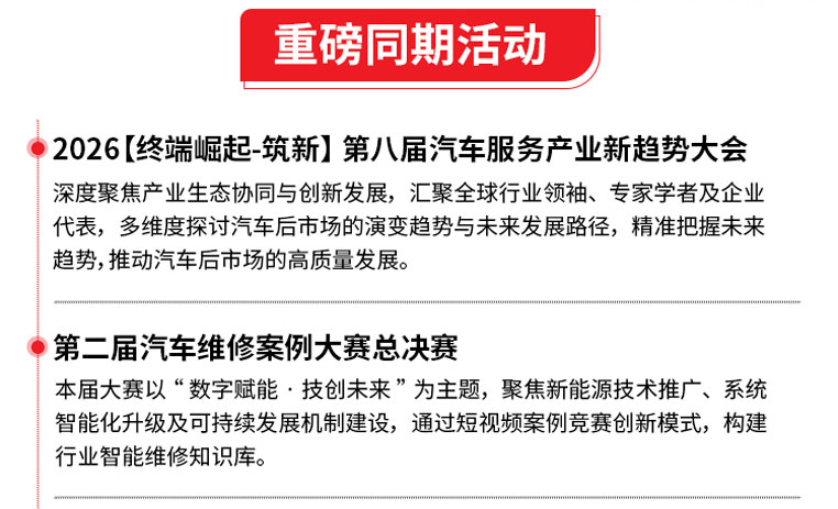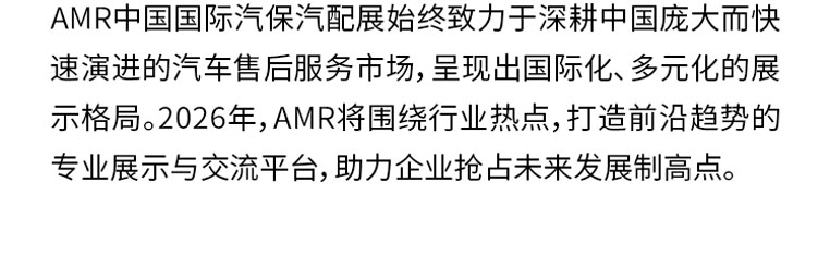 聚势启新,亚太地区深具影响力的汽车后市场服务平台——AMR中国国际汽车维修检测诊断设备、零部件及美容养护展览会(AMR中国国际汽保汽配展)将于2026年4月13至15日亮相北京。本届展会以“传承 筑新 可持续共栖”为主题,基于四十载的经验沉淀,积极拥抱技术创新,助力企业应对行业变革与转型升级,推动汽车后市场绿色可持续发展。展会将全面展示汽车售后服务市场在数字化转型、绿色低碳发展、智慧交通及产业优化升级方面的最新成果与未来趋势,为展商带来广阔的展示空间、便捷的参展体验与丰富的商业机会。