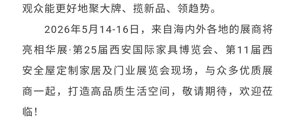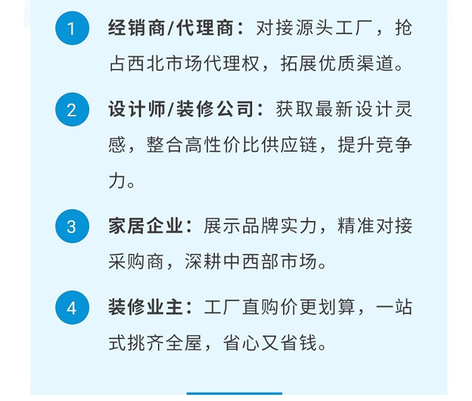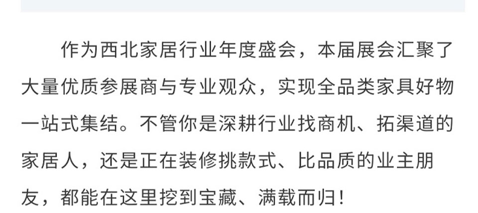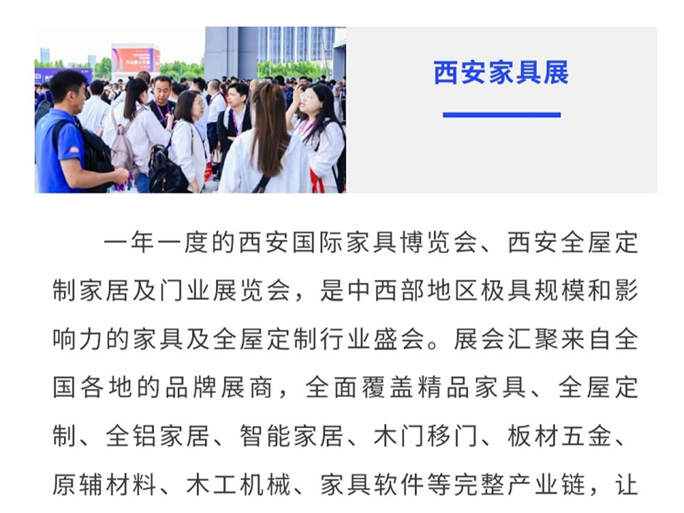 立足大西安,辐射中西部。西安国际家具博览会依托西安独特的地缘优势和战略位置,历经24届的深耕发展,累计展览面积近110万㎡,接待观众118万人次以上,已蜕变成为中西部地区极具规模与影响力的家居产业渠道营销平台、产业链供应合作平台、家居生活方式推广平台、大众体验消费平台。