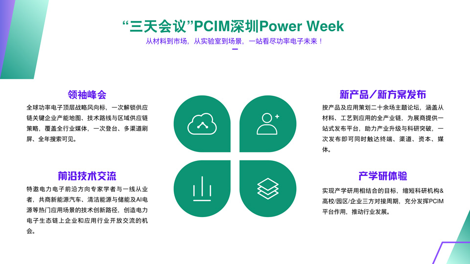 PCIM Asia Shenzhen 2026凭借精心打造的多元活动矩阵,三天不间断同期活动,汇聚行业与学术界的专家,发布前沿研究成果、洞察行业趋势,为参会者倾力构建了一个促进深层次交流与链接的专业平台。