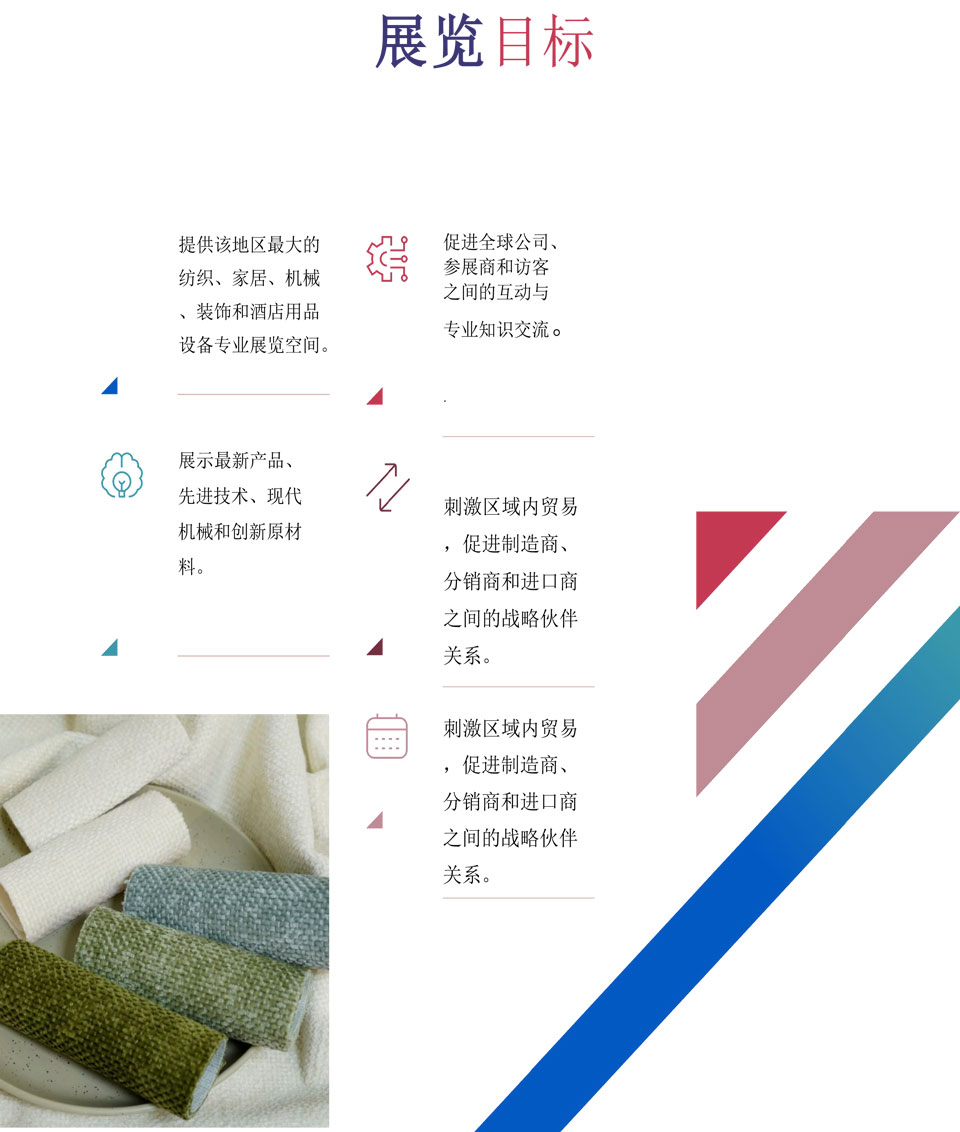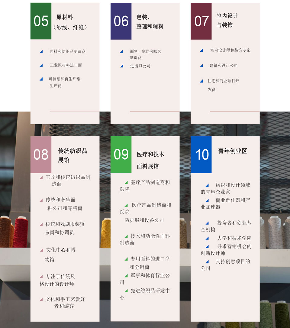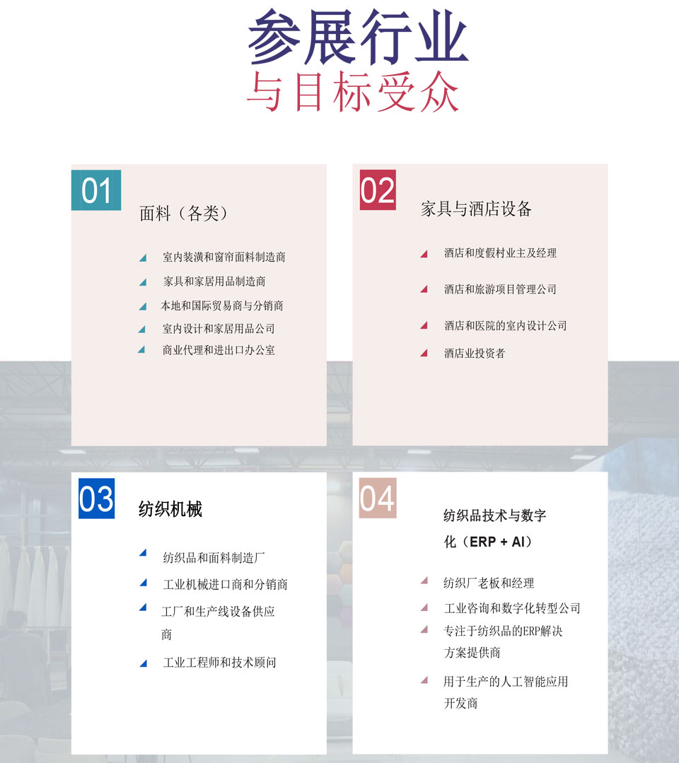 面料(各类):室内装潢和窗帘面料制造商、家具和家居用品制造商、本地和国际贸易商与分销商、室内设计和家居用品公司、商业代理和进出口办公室;