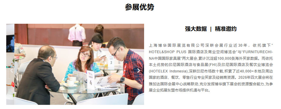 2026年,上海博华国际展览有限公司将依托英富曼集团全球网络资源优势,在东南亚市场打造一场规模空前的行业盛会。届时,亚洲酒店及商业空间博览会将携手亚洲家具与装饰博览会、印尼国际酒店与食品展(FHI)及印尼国际酒店及餐饮业博览会(HOTELEX Indonesia),共同为建筑装饰设计、家具家居、酒店及商业空间、餐饮食品等多个行业领域搭建一个高端、专业的B2B交易平台。展会将聚焦于高端产品与定制化服务,深度聚焦东南亚市场发展机遇,为参展企业提供全方位的商业对接服务,助力企业开拓东南亚市场,共创行业发展新未来。