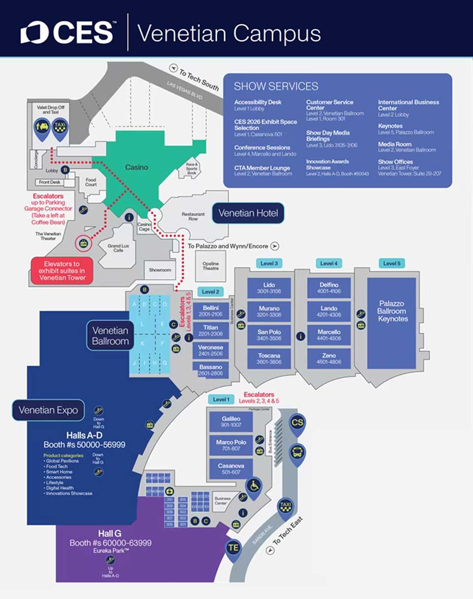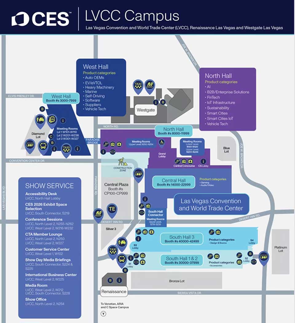拉斯维加斯会展中心(LVCC):分为 Central Hall、South Hall、West Hall、Tech East 等区域,分别聚焦消费电子核心品类展示