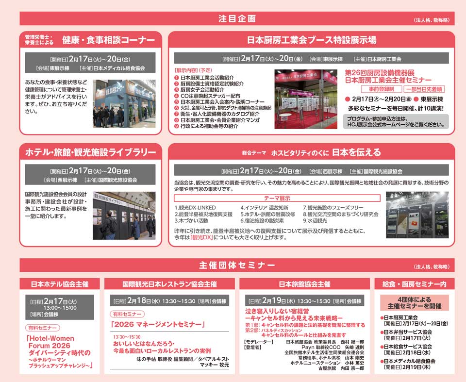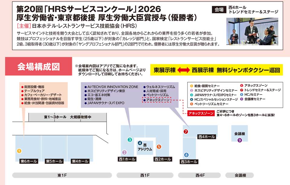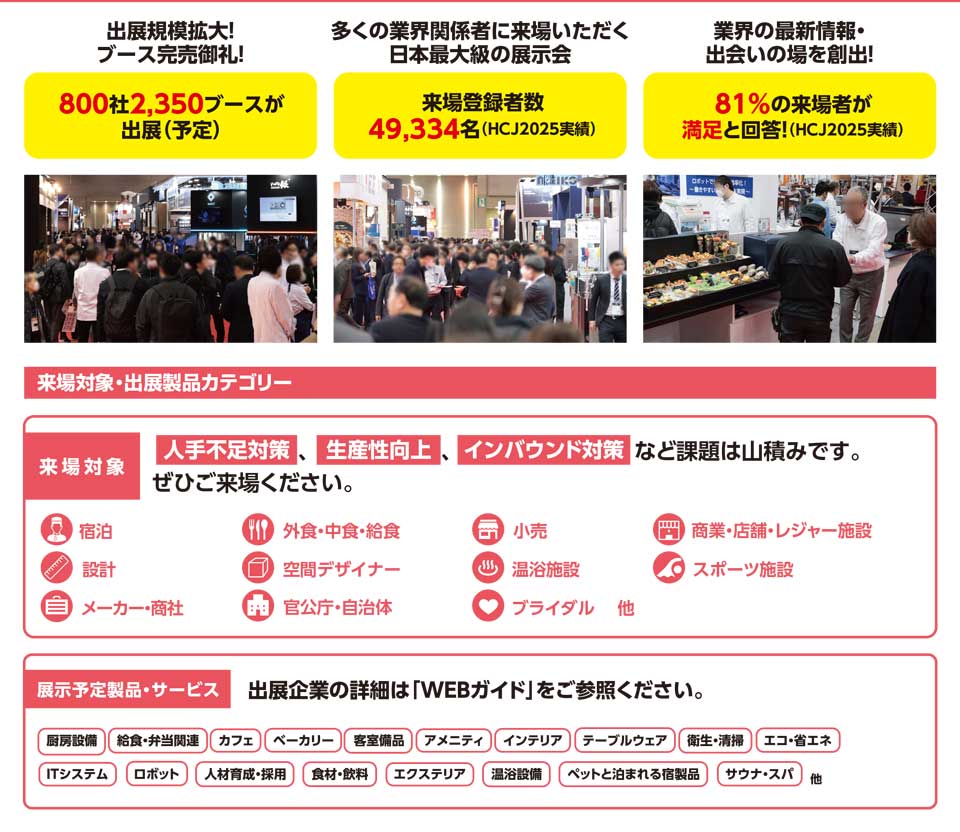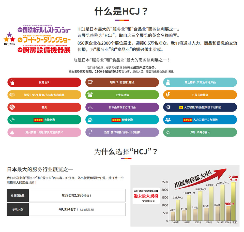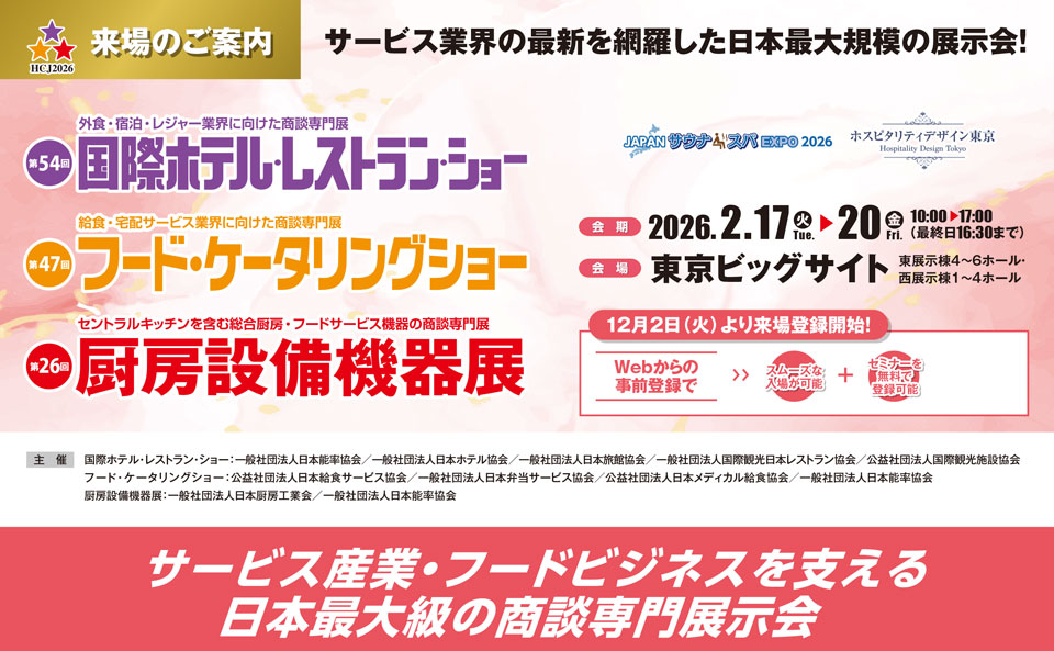 日本东京国际酒店、餐饮设备品及食品服务展(HOTERES JAPAN)将于2026年2月17日至20日在东京国际展览中心(Tokyo Big Sight)举行,由日本能率协会主办。作为1972年创办的日本最大规模酒店餐饮设备专业展,本届预计展出面积26,500平方米,汇集841家参展企业、1,900个展位,吸引68,000名专业买家。展会涵盖餐厨用品、客房大堂设备、清洁洗衣系统、纺织布艺、咖啡茶饮、智能酒店科技等全品类,深度对接日本44.6万亿日元的酒店餐饮业市场。凭借东京在亚洲酒店业的核心地位,该展已成为世界最专业的酒店业贸易平台之一,是开拓日本及亚洲高端供应链市场的首选渠道。