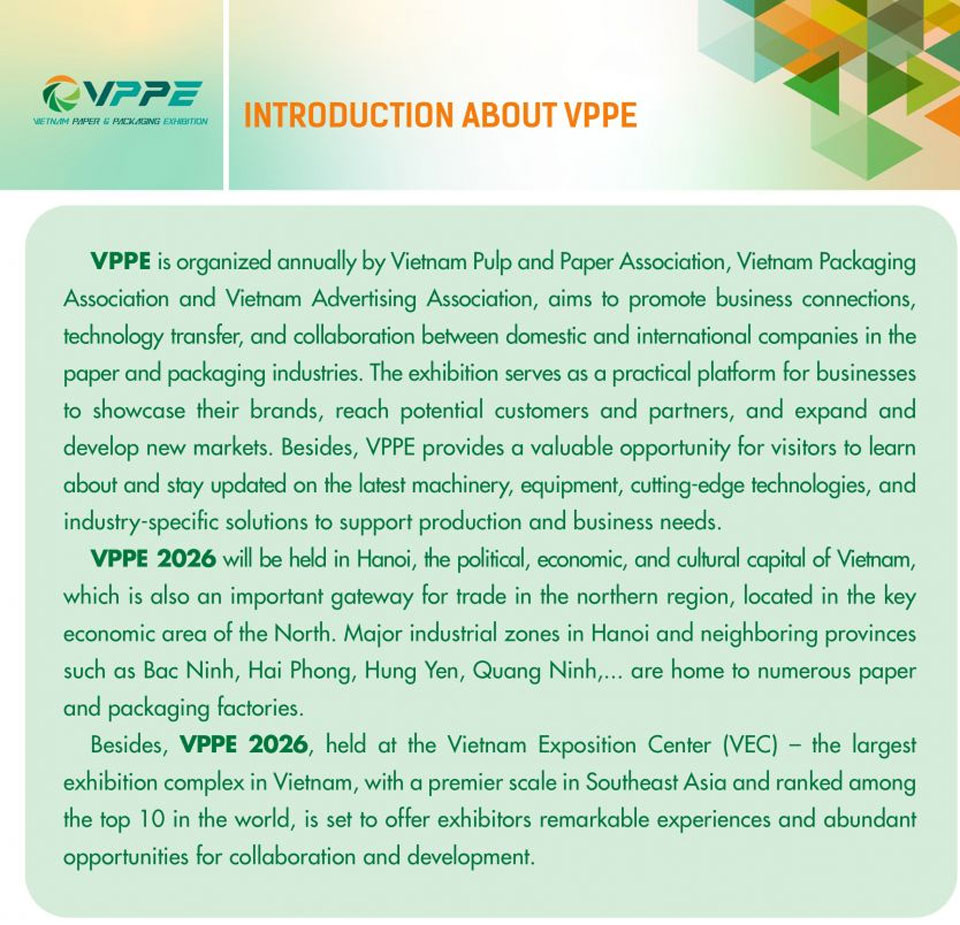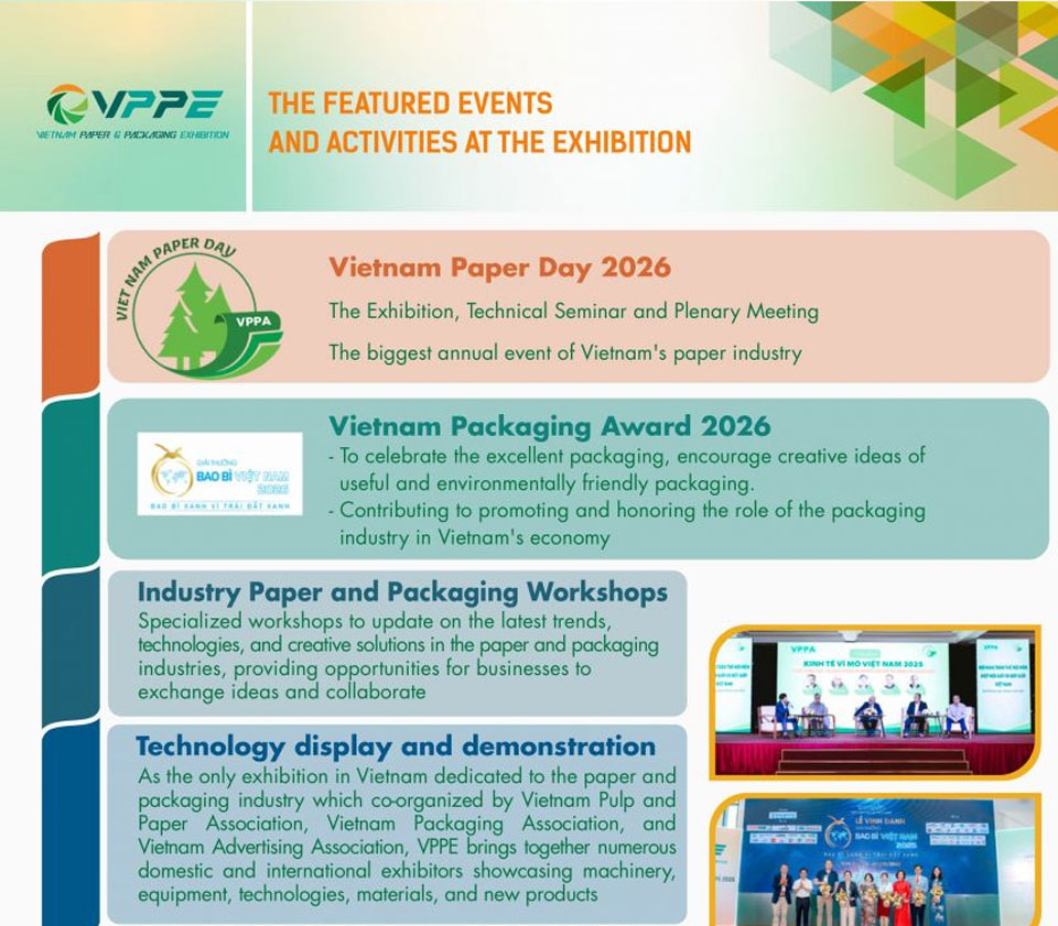 VPPE由越南造纸协会、越南包装协会和越南广告协会每年联合主办,旨在促进国内外纸业和包装行业企业间的商业联系、技术转让与合作。该展览会是一个实用平台,供企业展示品牌、接触潜在客户和合作伙伴、拓展和发展新市场。此外,VPPE为参观者提供了一个宝贵的机会,让他们了解并掌握支持生产和业务需求的最新机械、设备、尖端技术和行业特定解决方案。