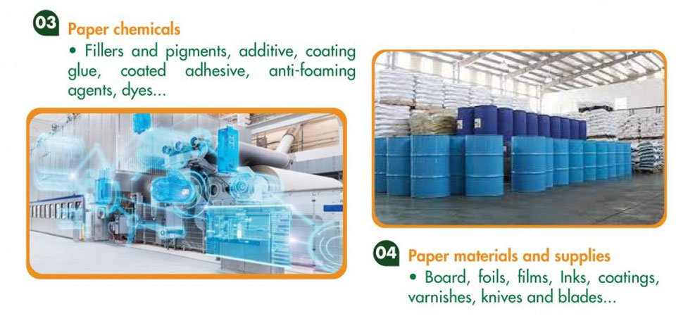 纸浆制造机械设备及辅件、造纸机械设备、纸箱机械设备、零部件、辅助器材及仪器仪表、加工纸设备、脱水、压榨设备、泵、阀门、管道及造纸新技术设备、造纸节能技术及设备; 瓦楞纸设备、包装纸设备,搬运及打包机械和设备。