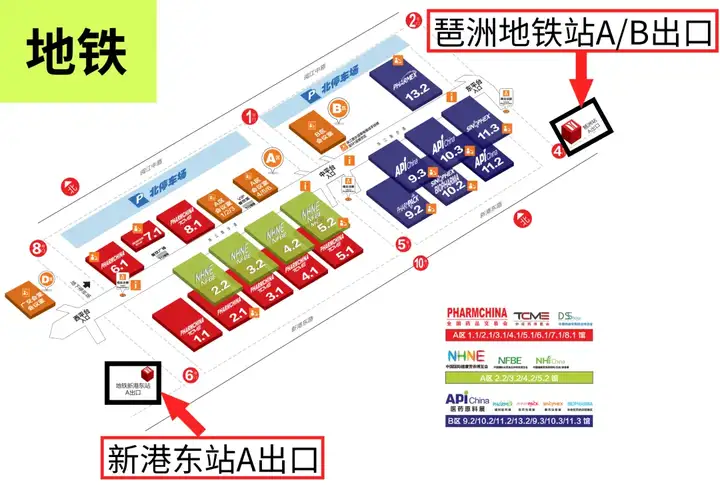 地铁站:乘坐广州地铁8号线,至“新港东站”A出口、“琶洲地铁站”A/B出口。