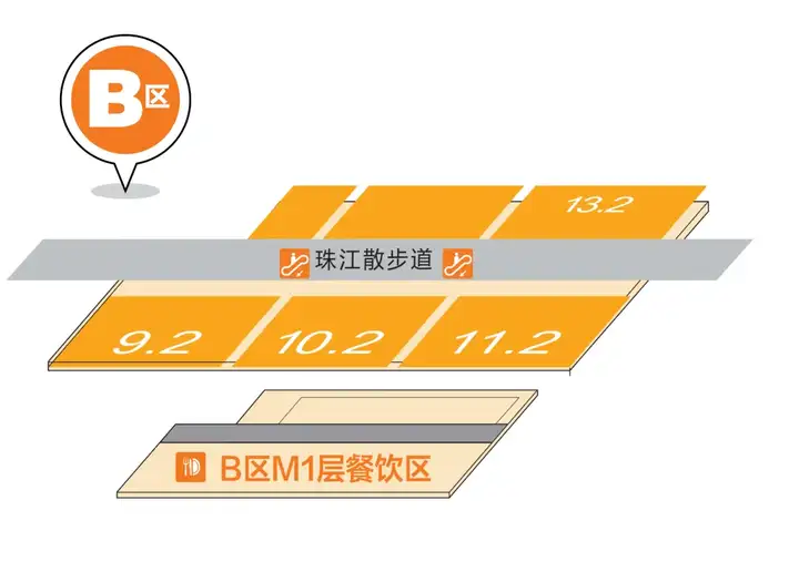 珠江散步道乘电梯或手扶梯至M1层餐饮区
