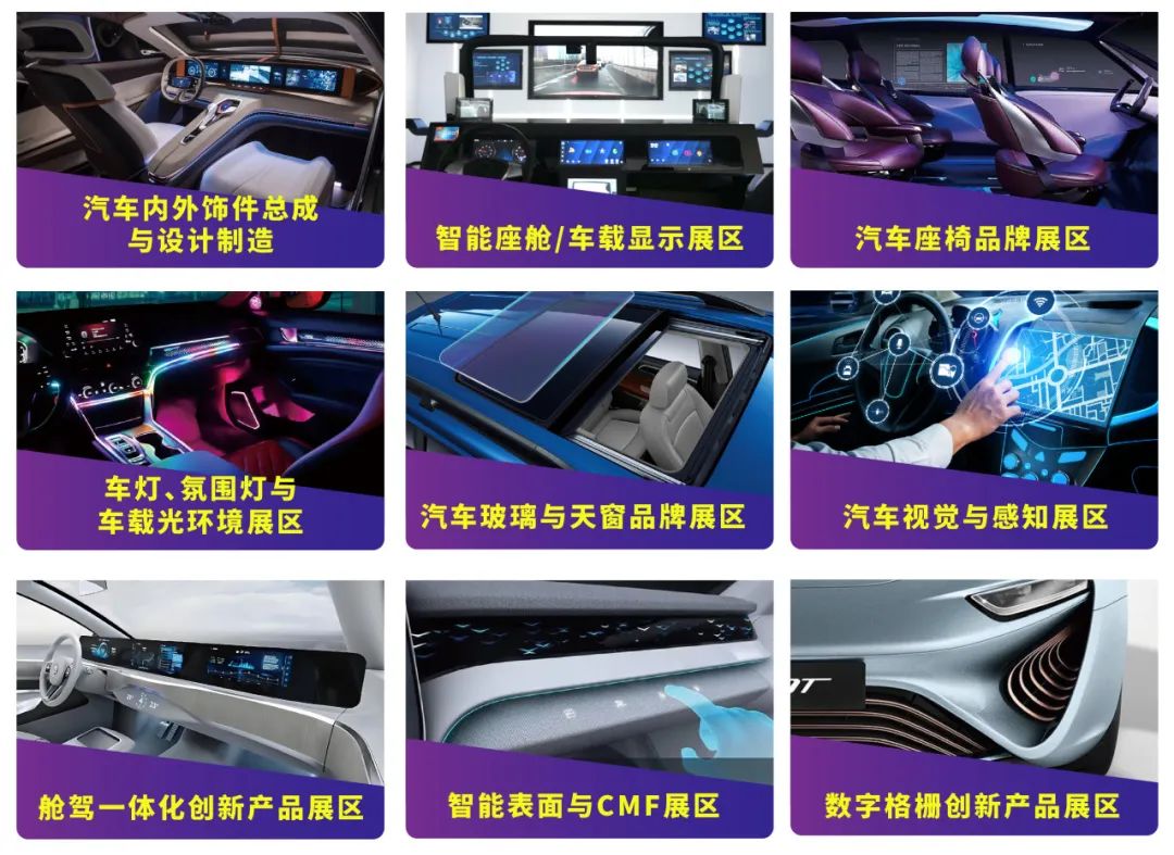 展区规划紧扣行业发展脉络,围绕产业链关键环节精细划分,专注于汽车内饰与外饰领域,精细规划九大特色主题展区,集中展示内外饰总成、座椅、智能座舱 、车载显示、汽车塑料件、装饰件、方向盘、门板、顶棚、车身覆盖件、车身结构件、外观件、智能汽车电子、被动安全、 保险杠、后视镜、车灯与车辆照明以及应用领域新材料、新技术、新设备、新工艺。