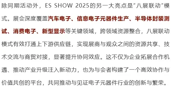 从技术融合到商业落地,从资源链接到机遇捕捉,ES SHOW 2025为电子产业搭建起通往未来的桥梁。10月28-30日,深圳国际会展中心(宝安),诚候全球电子领域从业者共赴盛会!