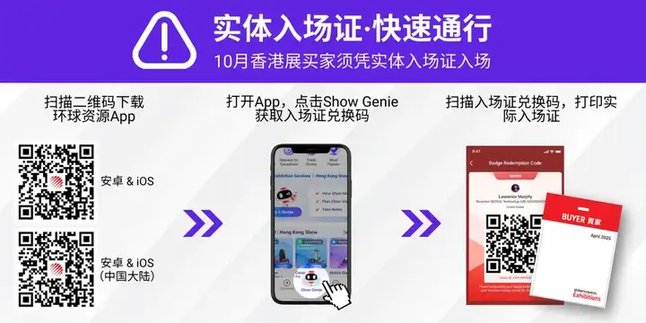 实名入场:2025年10月香港展会期间,所有买家须佩戴实体入场证入场。请提前下载环球资源 APP,获取入场证兑换码,以便在现场打印纸质胸牌,告别排队烦恼!