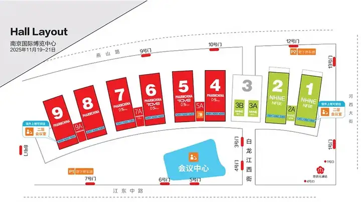 自驾:导航至南京国际博览中心12号出入口驶入P1地下停车场,或导航至南京国际博览中心7号出入口驶入P2地下停车场,停车后根据指引进入展馆,可至1-9号馆。
