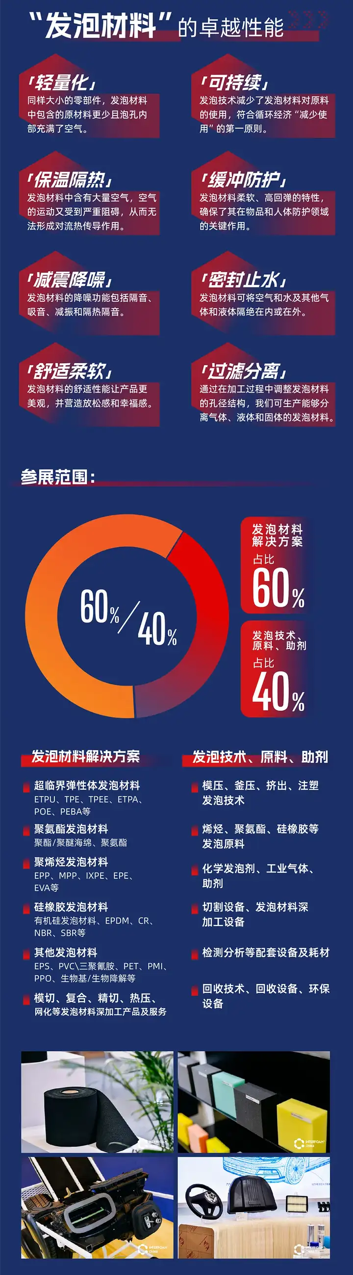 Interfoam发泡材料展创立于2019年,作为服务亚洲市场的发泡产业会展平台,Interfoam 始终致力于推动发泡技术的创新发展。发泡材料凭借其卓越的性能,在多个领域发挥着关键作用。Interfoam 将持续在多领域推动发泡材料的应用实践,助力我们的参展商达成交易、协助我们的观众寻获适配的发泡解决方案。