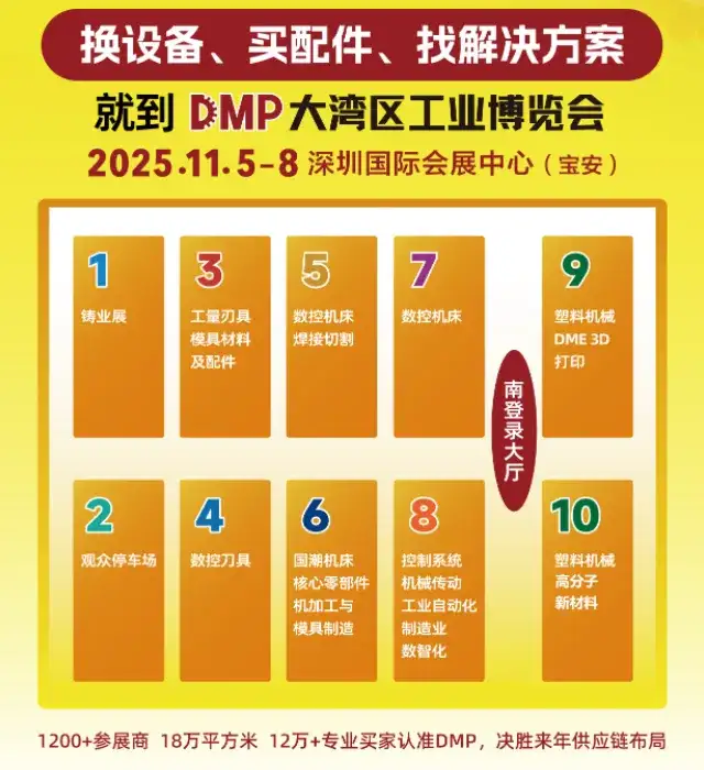 第26届DMP大湾区工业博览会将于2025年11月5日—8日在深圳国际会展中心(宝安)举办。本届DMP工博会将聚焦国潮机床、数智化工厂、精密零件加工、模具制造、注塑、压铸成型等行业热点,设立多个产业联动专区,涵盖3C电子、医疗器械、新能源汽车、“黑灯工厂”、潮玩制作、人形机器人等产业,将为观众带来令人惊叹的“全产业”新品与最新技术。