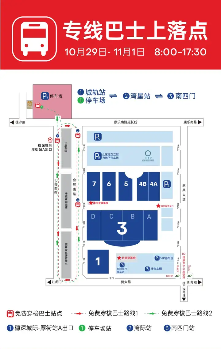 飞机/高铁:穗深城际铁路,厚街站A出口,可搭乘展会免费穿梭巴士到现场