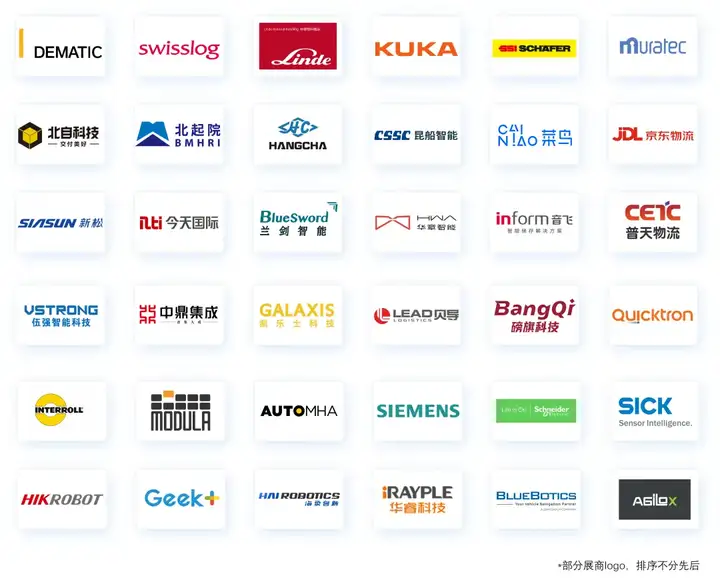 德马泰克、Swisslog、胜斐迩、北自科技、北起院、昆船、新松、村田、今天国际、菜鸟、凯乐士、兰剑智能、江苏华章、音飞、井松、贝导、普天物流、MIAS、卡迪斯、伊东、英腾、中科微至、中电二所、新北洋、Automha、Modula、伍强、六维、史必诺、慧仓、科捷、原力聚合、磅旗、玫德、哥伦布、华恒、临工智能、中扬、华德、上虹、赛那德、蓝天、甲佳、鸿安、派迅、德力、凌芸壮智等