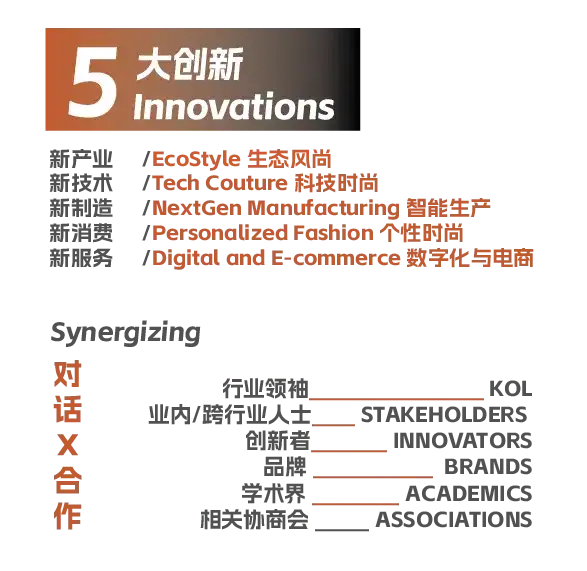 企业要在新常态下成功出圈,必须以技术创新、绿色生产、可持续发展为营运的方针。ShanghaiTex 2025将立足传统的板块,包括纺纱、织造、针织、染整、印花等技术,并以五大创新的发展方向,连同特式展示,探索纺织行业升级优化的新商机: