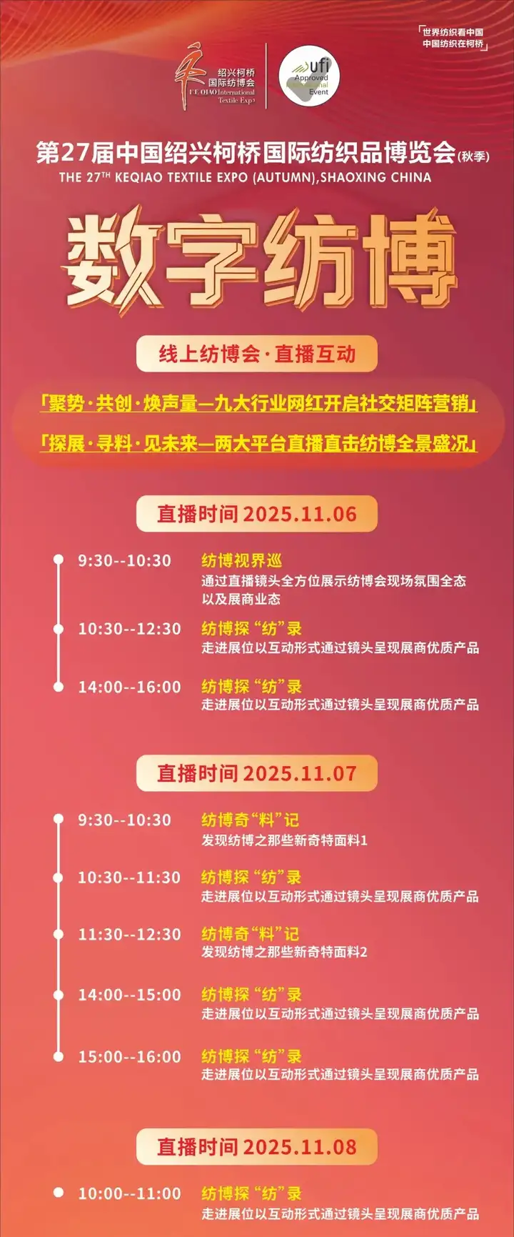展后,我们将持续推出丰富内容,增强观众对展会的关注与讨论,积累口碑,形成从引流、互动到沉淀的完整传播链。通过更沉浸的直播体验和更精准的用户触达,2025数字纺博将持续提升柯桥纺博会的传播效果与行业影响力,帮助纺织企业拓展渠道、链接资源、发现商机,打造兼具深度、温度与广度的数字纺博。