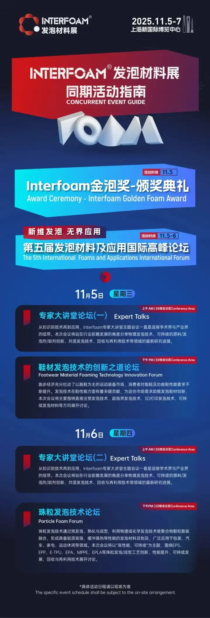 作为深度服务于亚洲发泡材料行业的平台,Interfoam发泡材料展同期将举办“2025 Interfoam金泡奖颁奖典礼”与“第五届Interfoam发泡材料及应用国际高峰论坛”。