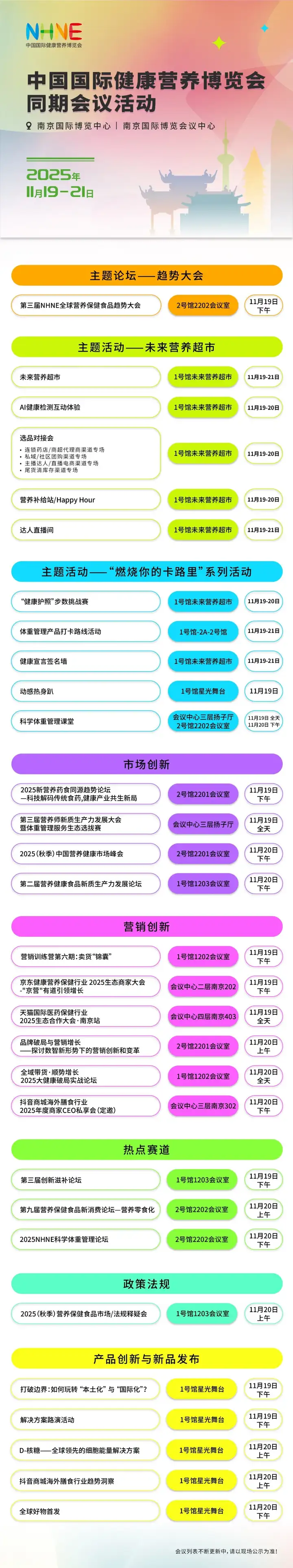 2025年11月19-21日,NHNE中国国际健康营养博览会将在南京国际博览中心盛大举办!本届展会将集结来自30多国1200+企业,超5000款新品全球首发,覆盖保健食品、健康食品、功能原料、益生菌、特医食品、OEM制造等十余个关键领域。