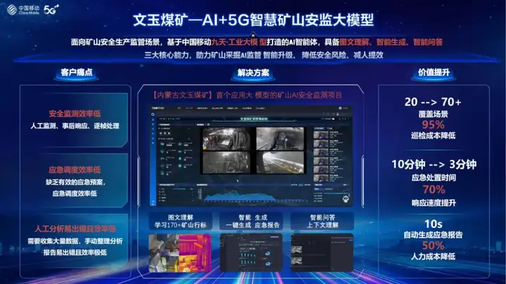 通过电子沙盘+实体沙盘展示面向矿山安全生产监管场景,基于中国移动九天·工业大模 型打造的AI智能体,具备图文理解、智能生成、智能问答三大核心能力,助力矿山采掘AI监管 智能升级、 降低安全风险、减人提效。