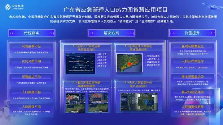 中国移动聚力推进“AI+”赋能成长,聚焦灾害监测、安全生产、应急指挥、应急通信、智慧消防等场景的AI融合,打造AI+辅助决策、AI+受灾分析、AI+防汛防台、AI+矿山安监、AI+化工监管、AI+应急救援、AI+现场指挥、AI+航空应急、AI+应急叫应、AI+森林防火等多场景的信息化解决方案,助力提升突发公共事件处置保障能力和应急行业信息化水平。