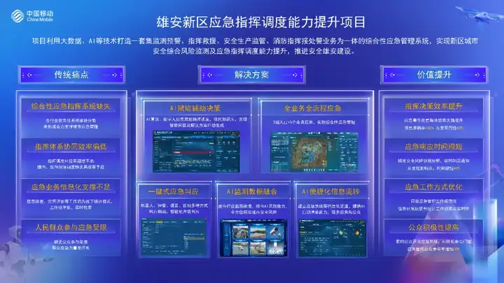 中国移动利用大数据、AI等技术打造一套集监测预警、指挥救援、安全生产监管、消防指挥接处警业务为一体的综合性应急管理系统,实现新区城市安全综合风险监测及应急指挥调度能力提升,推进安全雄安建设。