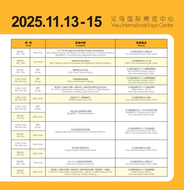 2025中国义乌国际小商品博览会-进口商品展(以下简称“义博会-进口商品展”)将于2025年11月13日至15日在义乌国际博览中心隆重举办。为贯彻落实“积极主动扩大进口”国家战略,展会以高质量建设进口贸易创新发展试点为目标,积极承接进博会溢出效应,紧扣“贸易促进、贸易创新”功能定位,拓展义乌与各国家相关地区间的经贸合作,力争在推进扩大优质消费品进口、拓展多元化的进口渠道等方面发挥更大作用。义博会-进口商品展由浙江中国小商品城集团股份有限公司主办、义乌中国小商品城展览股份有限公司承办。本届展会展览面积4万平方米,国际标准展位1650个,设A1馆咖啡&酒展区、B1馆品质生活展区、C1馆综合贸易展区和D1馆食品&友城展区,将集中展示进口消费用品、进口食品、进口服饰及配件、咖啡及酒类、跨境电商及国际贸易服务商、国际经贸合作等进口相关行业。